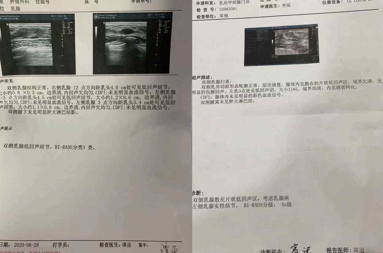 屋漏真的会有连夜雨,到了20年,公司正好组织体检,这时我才知道我有了乳腺结节!而且已经3级了!检查的医生给我开了乳癖消、小金丸等药物,让我先吃一段时间再复查,还叮嘱我一定要心情乐观,改变生活习惯!我谨遵医嘱按时吃药差不多3个月时间,去复查却发现没有任何好转,没有办法只能继续吃药,就这样断断续续吃了快半年的药,中间也有复查过,但情况一直没有任何好转,我真的是烦透了,又担心,又恐惧。后来感觉胸部疼痛越厉害,碰都不能碰!严重的时候腋窝、背部也疼,像针扎一样,我又去了医院检查,但这次的结果却不容乐观,医生说肿块更大了,结节也4a级了,易恶化,让我手术切除肿块,再拖下去更严重!我不敢做手术,我觉得做了手术就是不完整的,我要保乳!